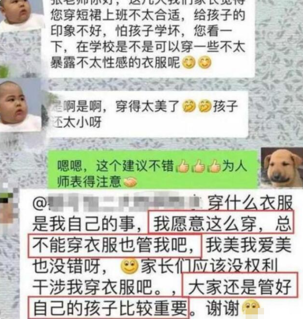 家長以及先生進行溝通也要考究方式要領 在下面的相識記載截圖之中,咱們也可以望到關于教員穿戴的這件工作,家長以及先生的溝通并沒有很到位,在人人的語氣之中都望出了對于這件工作的不滿。 下面有一名家長提到了“為人師表”,而教員則歸應你沒資歷管我,還帶了微笑的表情,這也申明兩邊之間的溝通并不是很到位。