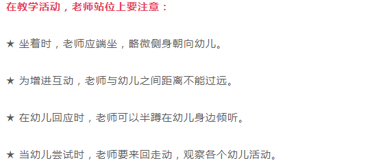 一日生涯中先生的規範站位的焦點:作為幼師,一位業餘的幼教事情者,咱們在站位上要眼里有幼兒,眼睛尾隨幼兒的舉動。如許不僅能保障幼兒的寧靜,更能促進師幼互動哦。 【圖文素材泉源于收集參考清算,若有侵權請聯系小編刪除。】
