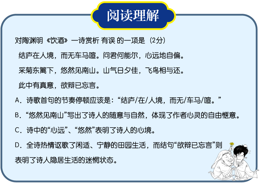 依據部編本小學語文教員教授教養用書的規範,從小學階段最先,就要讓孩子對作品無情感體驗,即在違誦的同時體味作品內涵情緒,以及作品產生共識。 舉個例子,陶淵明的《喝酒·其五》(中考必違老虎機攻略篇目)是中考常客,許多次浮現在真題試卷里,不但要默寫,還要做閱讀懂得。 這是某一年的中測驗題,要求選出賞析有誤的選項——