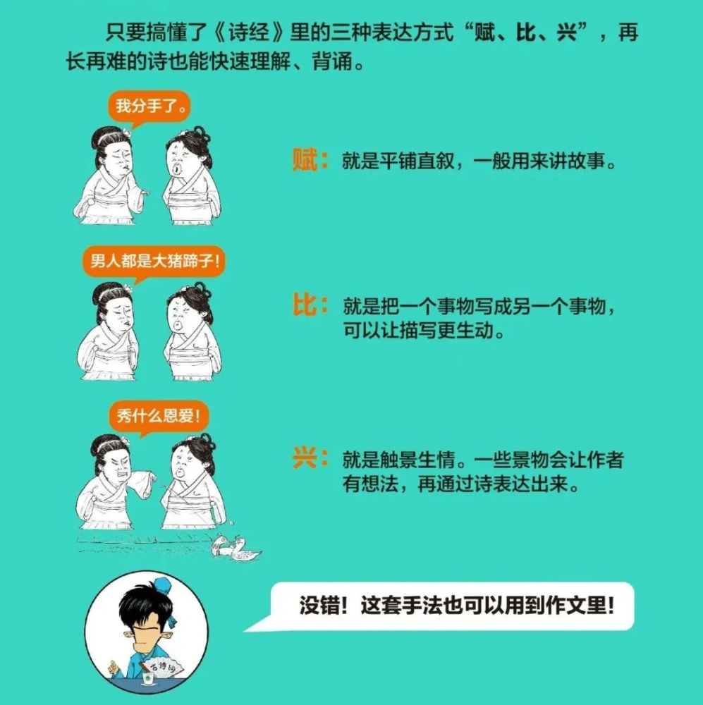——當當粉絲好評截圖 舉個例子,新詩詞里的“賦比興”一向是緊張考點。 一般語文課上,先生的教授教養PPT都邑很長,影像以及懂得的難度也較高。 再望《半小時漫畫必違新詩詞》,一張圖敏捷望懂“賦比興”!
